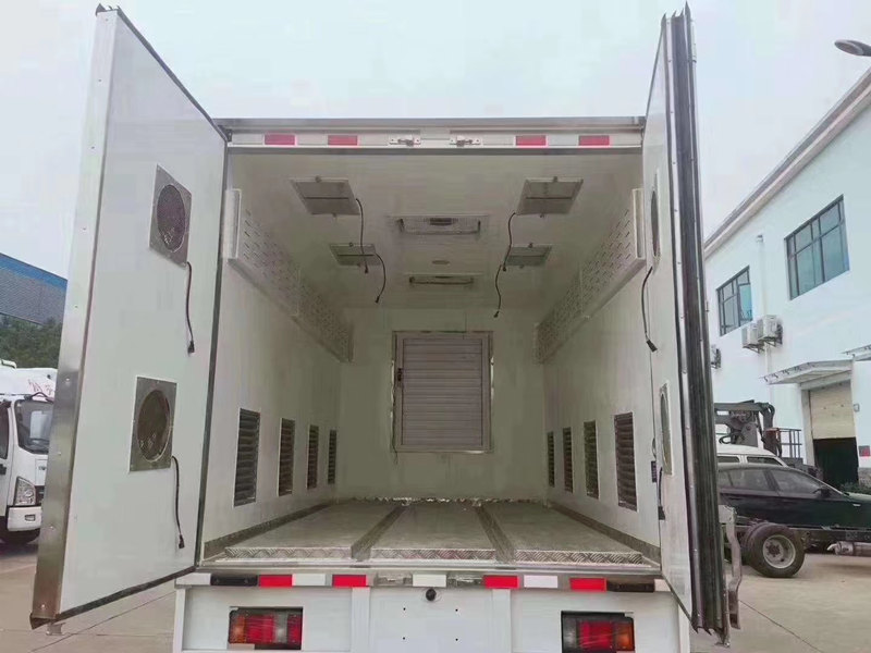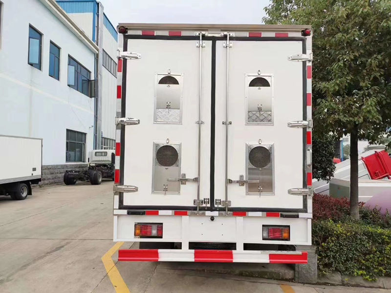 (2)厢板材质:内外壁板选用国内优质2.2mm玻璃钢(不吸光、隔热性好、硬度强、抗氧化);中间保温层为XPS挤塑聚笨板;厢体厚度8CM。地板采用铝花纹板,门边条采用迷宫式橡胶密封条。